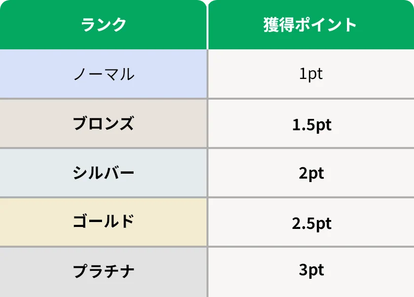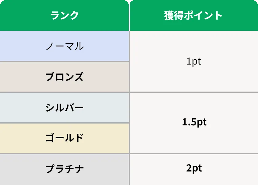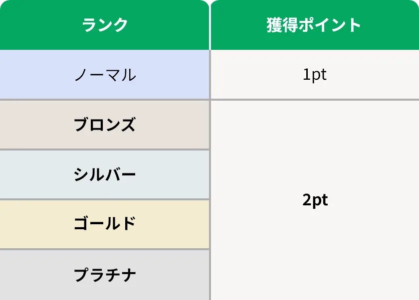 ステイタスはノーマル(フリーメンバー)+4段階(プレミアムメンバー)あり、毎年12月末時点での獲得合計ポイント数によってステイタスを決定し、次年度より新しいステイタスランクを適用いたします。