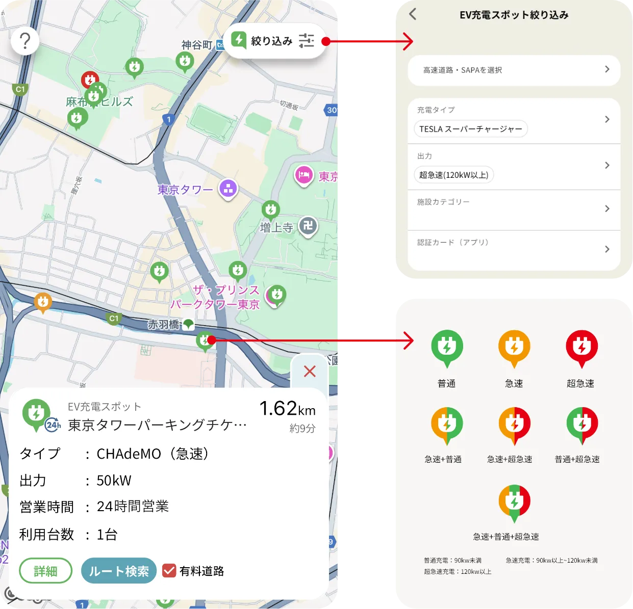 マップ上から現在地付近の充電スポットアイコンを確認することもできます。アイコンは充電の出力によって色分けされており、走行中でも一目で判別することができます。