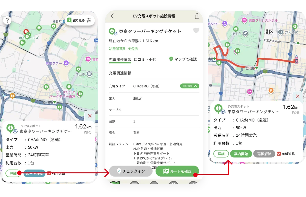 EV充電スポット施設情報は、充電スポットを選択した状態で、左下の「詳細」ボタンを押すと確認できます。 さらにEV充電スポット施設情報の右下の「ルートを確認」ボタンを押すと、目的地までのルートを表示します。その後、「案内開始」ボタンを押すとナビゲーションを開始しますので、道が分からない時も安心です。