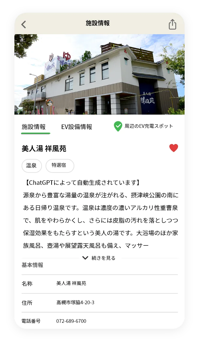 施設の詳細情報画面では、住所や営業時間などの基本情報のほか、ChatGPTの自動生成による紹介文なども閲覧できます。施設へのチェックインもこちらの画面から行えます。