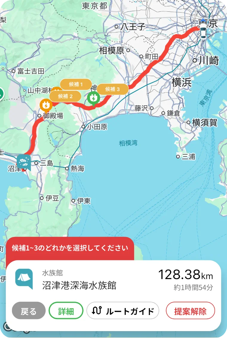 おでかけ提案ボタンから充電残量・充電タイプ・乗車人数を入力すると、状況に合わせてルート上にある最適な充電スポットを3つ提案します。候補が出なければ、充電が十分な状態(残量20%以上)で到着予定ということです。