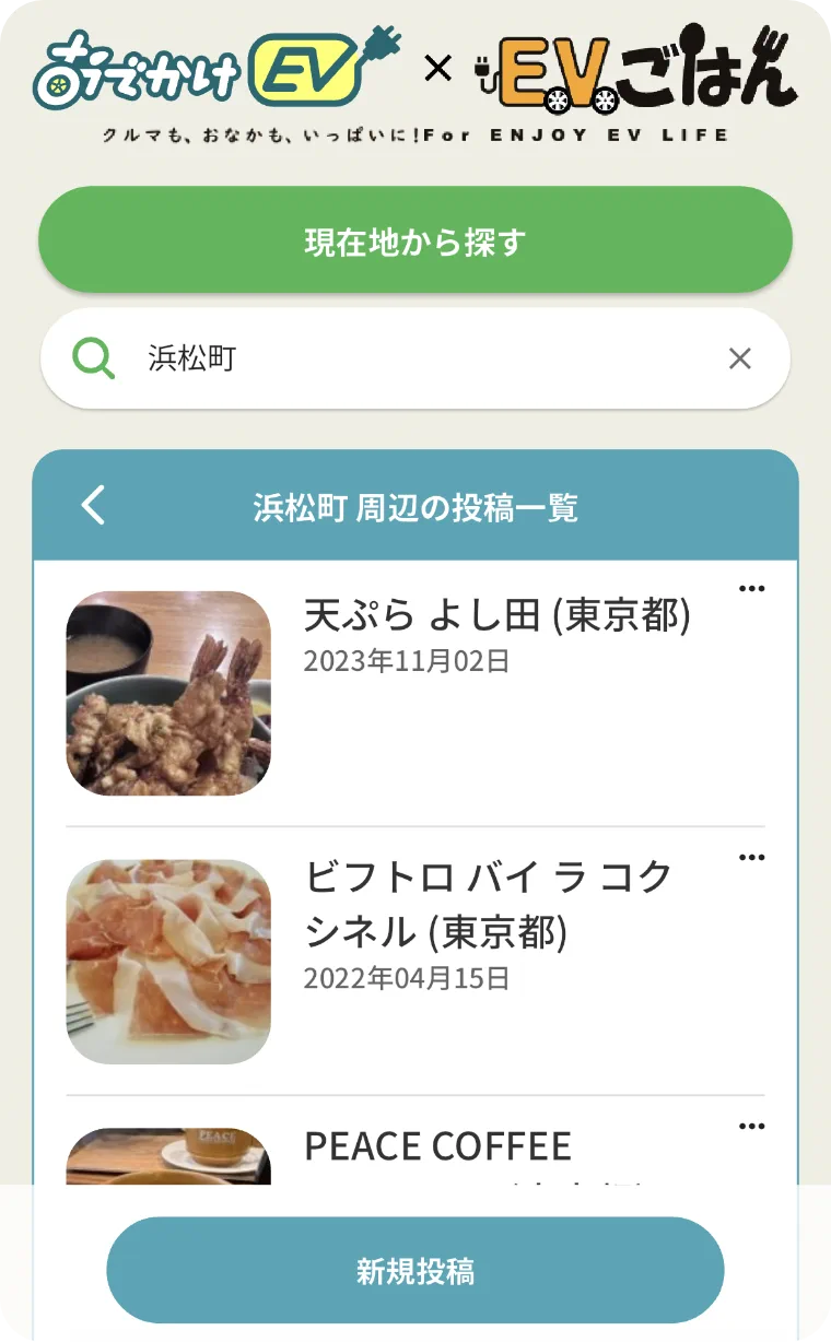おでかけEVのトップから、EV ごはんのロゴをタップしてください。EV ごはんのトップ画面では、現在地、または目的地周辺の投稿を検索することができます。