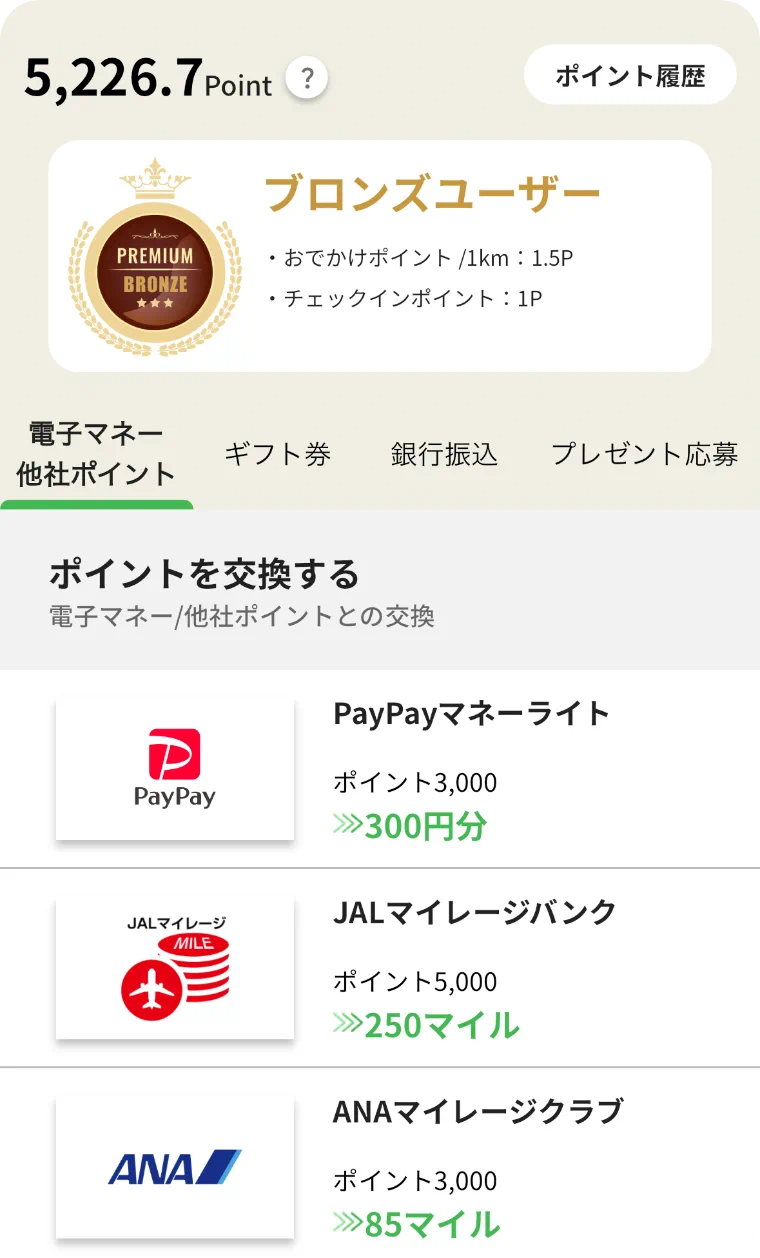 ポイント画面から、保有ポイントやステイタスランクを確認できます。貯まったポイントは、30 種類以上の交換先へ交換可能です。 ※ポイント交換にはプレミアム会員登録が必要です。